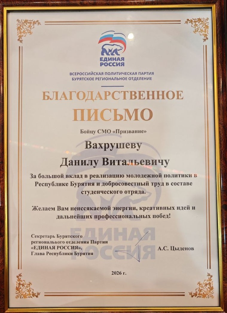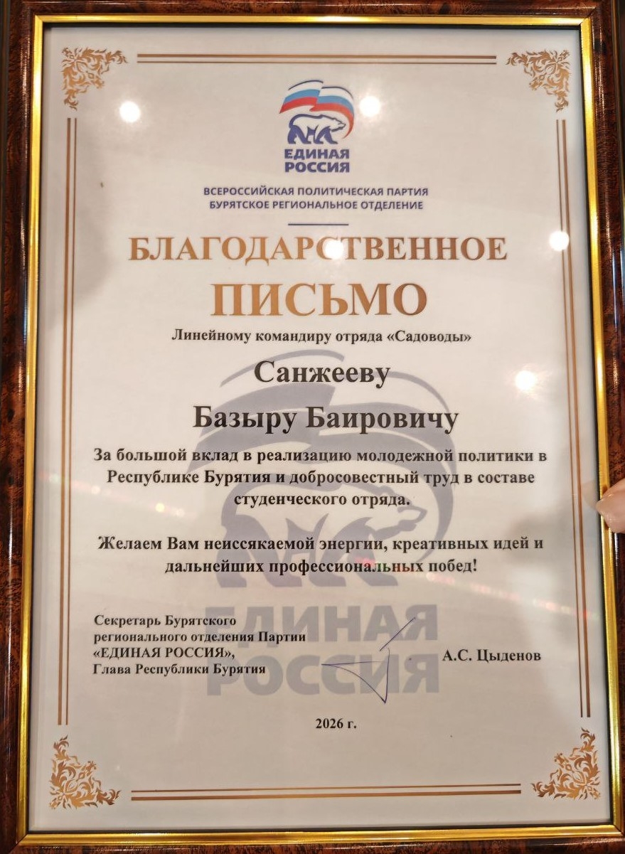Активисты студотрядов получили благодарственные письма от секретаря Бурятского реготделения «Единой России» за большой вклад в реализацию государственной молодёжной политики в республике.