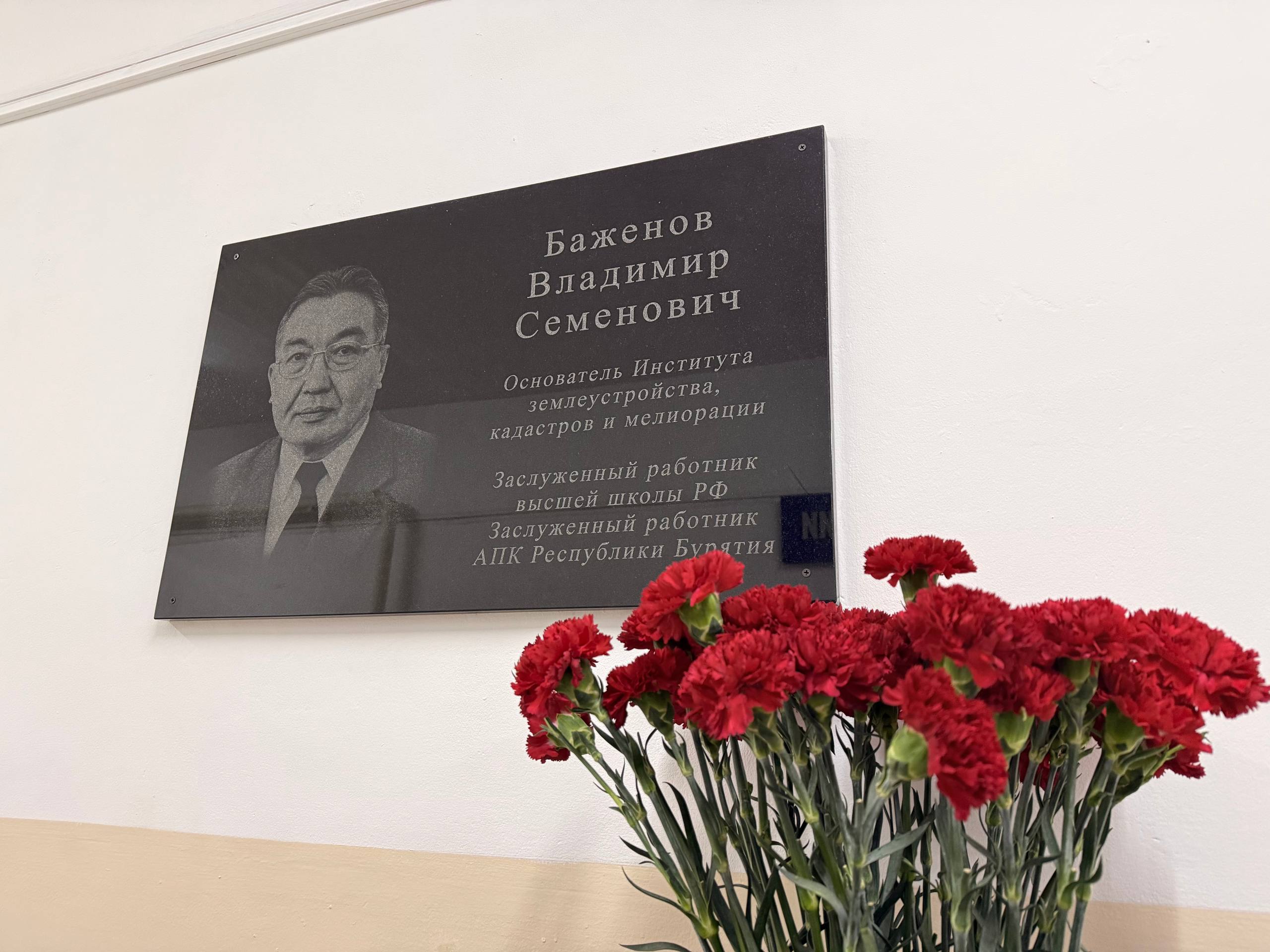 Завершающим аккордом юбилейного дня стало торжественное открытие мемориальной доски памяти Владимира Семёновича Баженова. Выпускник, основатель и первый директор Института землеустройства, кадастров и мелиорации (2005–2009 гг.), заслуженный работник высшей школы РФ, заслуженный работник агропромышленного комплекса Республики Бурятия, Владимир Баженов внёс неоценимый вклад в подготовку высококвалифицированных кадров не только для республики, но и для всей страны. Установка мемориальной доски призвана увековечить память о человеке, чья профессиональная и гражданская позиция служила ориентиром для нескольких поколений специалистов.