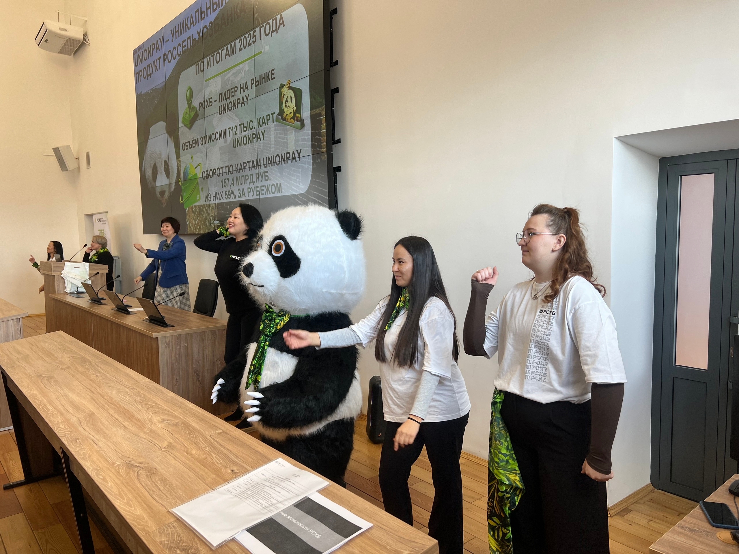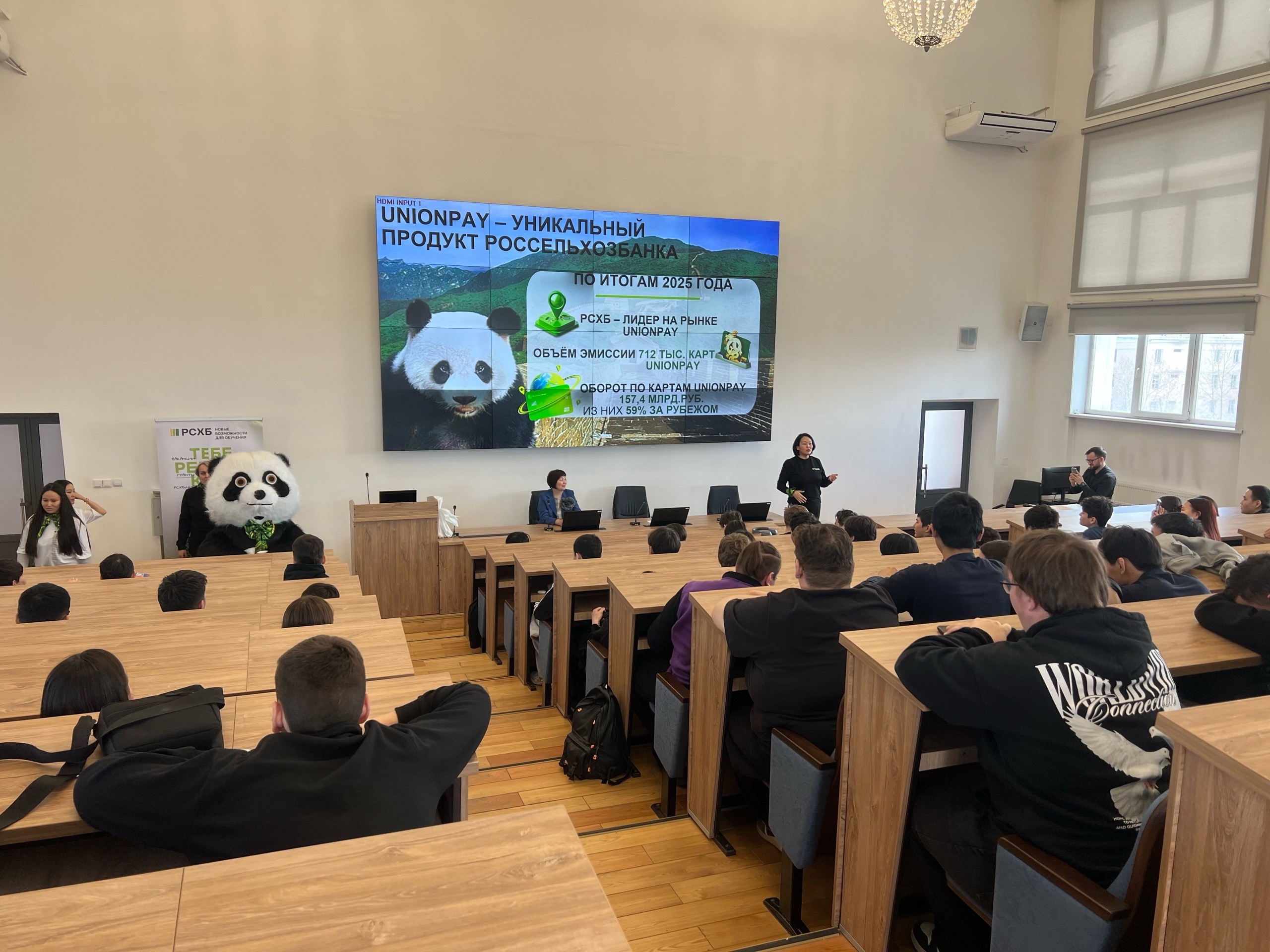 Встреча прошла в интерактивном формате: студенты не только слушали лекции, но и активно участвовали в обсуждениях. Ярким моментом дня стало знакомство с маскотом Россельхозбанка — пандой, которая подарила всем заряд бодрости и хорошего настроения, проведя утреннюю зарядку.